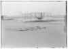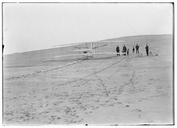 1903 machine on the launching track at Big Kill Devil Hill, prior to the December 14th trial. Four men from the Kill Devil Hills Lifesaving Station helped move it from the shed to the hill, accompanied by two small boys and a dog