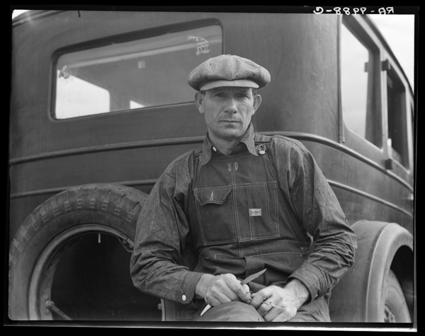1936 drought refugee from Polk, Missouri. Awaiting the opening of orange picking season at Porterville, California