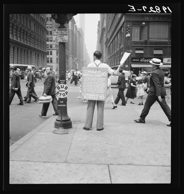 42nd Street and Madison Avenue. Street hawker selling Consumer's Bureau Guide. New York City