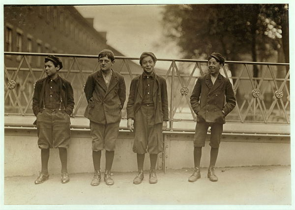 Boys working in Amoskeag Mills, Manchester, N.H. Smallest boy is Napoleon Cammery, 194 Merrimac St. Been in mill 1 year. Next boy is Jerry Moore, 352 Chestnut St. Martin Markey, 33 State St. Location: Manchester, New Hampshire.
