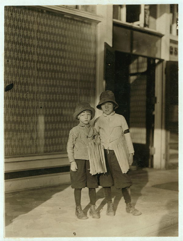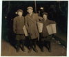 Selling the "Warheit" - Jewish paper, at midnight, on Delancey Street. M. Brown - 247 Monroe Street, Age 10 - on right. H. Brown - 247 Monroe Street, Age 12 - on left. Scheer - 263 Stanton Street, Age 14 - centre. Location: New York, New York (State)