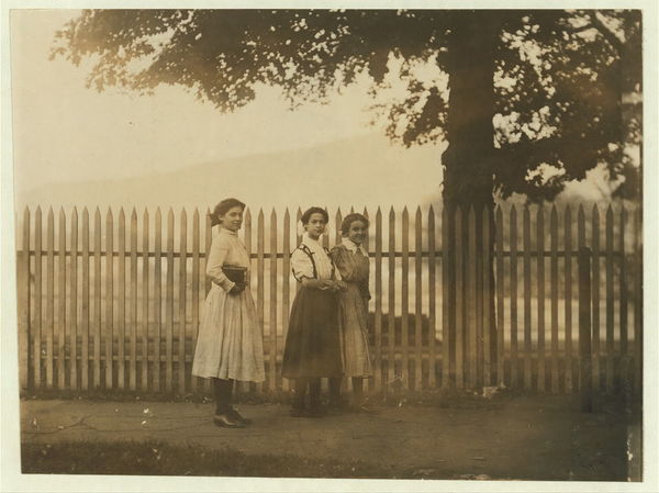 6:30 A.M. Three of the young girls working in Holden-Leonard Co., Bennington, Vt. Work slack, and the force small. Location: Bennington, Vermont.