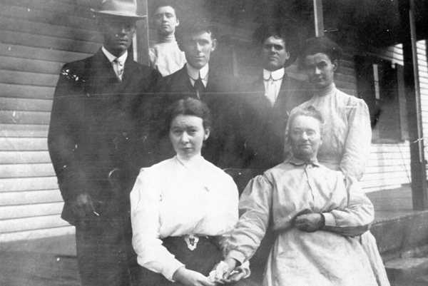 Alice Hedger Moore and her eight children at the Homestead, likely around 1900. Alice appears ve...