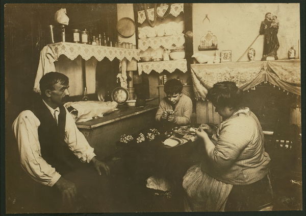 A Night Scene (Photo by 9:00 P.M.) Flower making. Family of Mary Bezzola, 212 Sullivan St., N.Y. George (10 years old) and Levia (9 years old) work until 9:00 P.M. when work is rushing. Location: New York, New York (State)