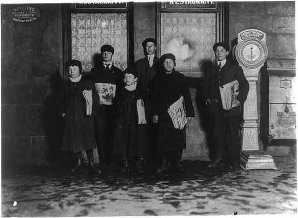 8:30 P.M. Group of newsboys selling at the depot, Hartford, Conn. Smallest boy 11 years old. Location: Hartford, Connecticut.