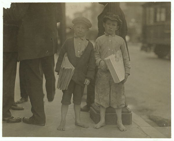 9 year old newsie and his 7 year old brother "Red." Tough specimen of Los Angeles newsboys. See California report. Los Angeles, California / Lewis W. Hine.