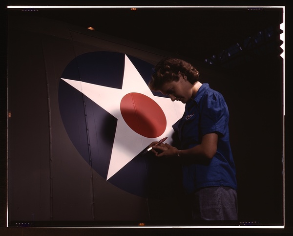 A candid view of one of the women workers touching up the U.S. Army Air Forces insignia on the side of the fuselage of a "Vengeance" dive bomber manufactured at Vultee's Nashville division, Tennessee