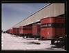 Truck trailers line up at a freight house to load and unload goods from the Chicago and Northwestern railroad, Chicago, Ill.