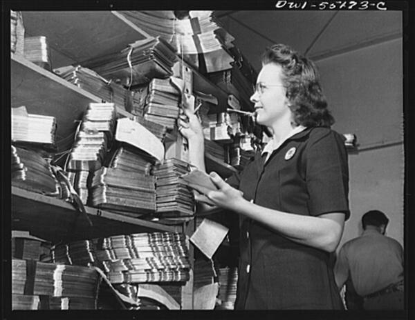 A clerk in the material preparation department receives orders over the phone for a number of parts. Every major part in plant has an index number and card which follows its progress to completion