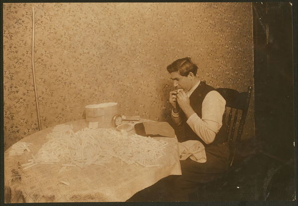 A common occurrence, licking the paper when making cigarette cases. (For complete details see Miss E.C. Watson's report.) Location: New York, New York (State)
