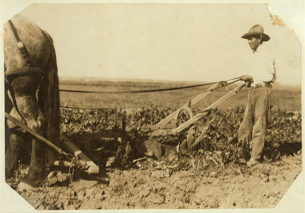 A Deere pulling machine, two horses. These merely loosen the soil, leaving the final pull to be exerted by the workers. Hine. Oct. 1915. Location: Colorado.