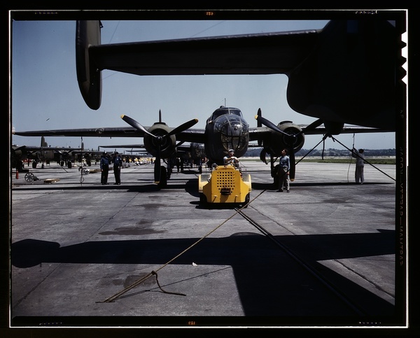A fast, hard-hitting new A-20 i.e., B-25 attack bomber is brought for a test hop to the flight line at the Long Beach, Calif., plant of Douglas Aircraft Company