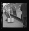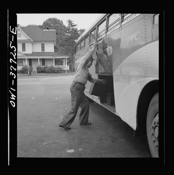 A Greyhound bus driver loading baggage at a small town between Chicago, Illinois and Cincinnati, Ohio