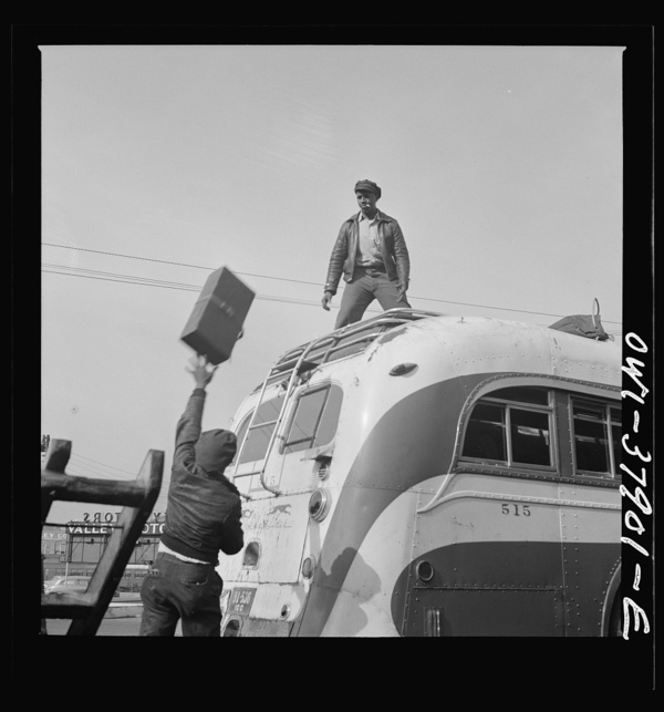 A Greyhound bus trip from Louisville, Kentucky, to Memphis, Tennessee, and the terminals. Loading a bus that carries baggage on the top. Chattanooga