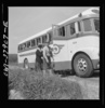 A Greyhound bus trip from Louisville, Kentucky, to Memphis, Tennessee, and the terminals. Greyhound driver helping woman with her bag. From a nearby farm, she flagged the bus on the highway