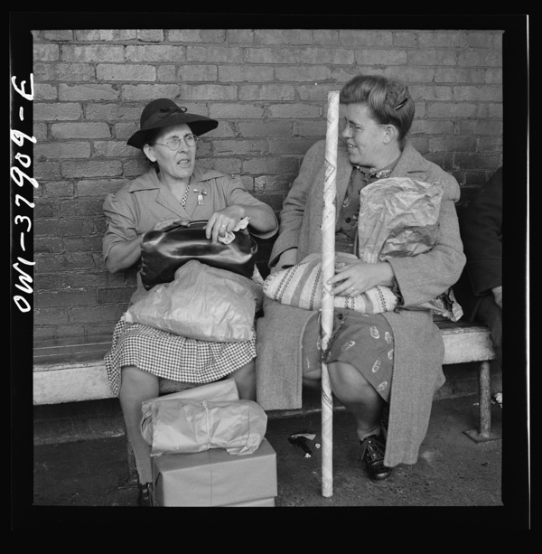 A Greyhound bus trip from Louisville, Kentucky, to Memphis, Tennessee, and the terminals. Farm women who came to Chattanooga to do Christmas shopping for sons overseas wait for the bus