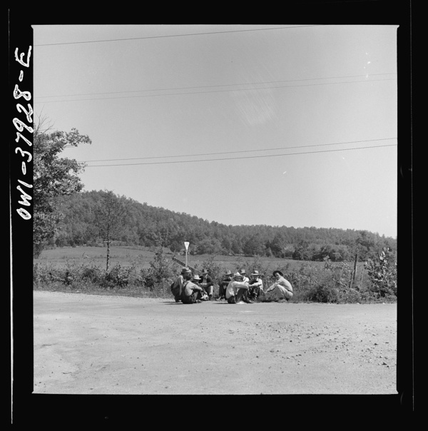 A Greyhound bus trip from Louisville, Kentucky, to Memphis, Tennessee, and the terminals. Men sitting by roadside on Sunday afternoon, between Memphis and Chattanooga