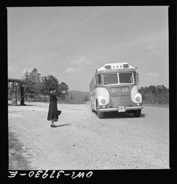 A Greyhound bus trip from Louisville, Kentucky, to Memphis, Tennessee, and the terminals. Hailing a Macon-bound bus on the highway in Georgia