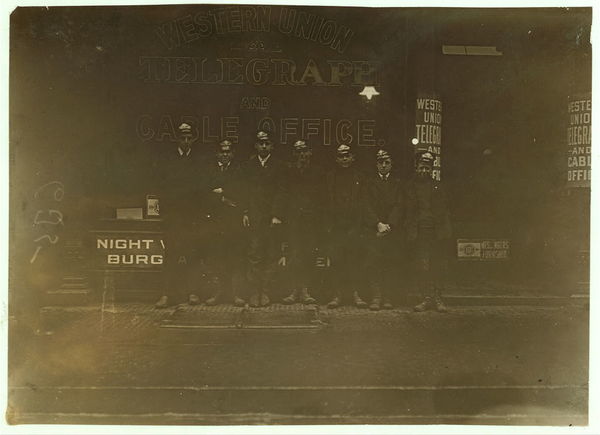 A group of messenger boys. These work until 11 P.M. Location: Bridgeport, Connecticut.
