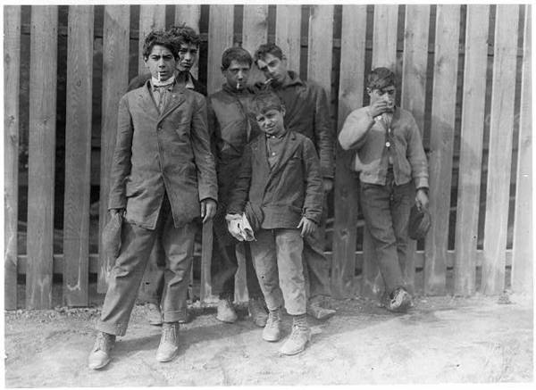A group working on night shift at Hereford Glass Works, Cape May Court House, N.J. Nov. 19, 1909. I saw the smallest boy carrying in shortly before midnight, November 18th. Location: Cape May, New Jersey.