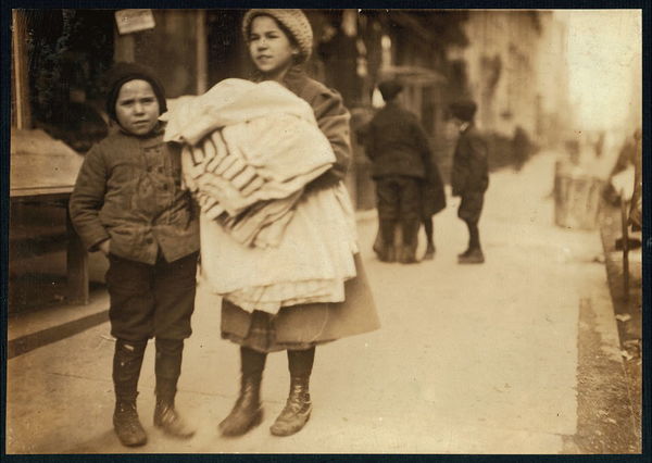 Nine and twelve-year-old children carrying coats home to be finished. Thompson St., N.Y. Location: New York, New York (State)