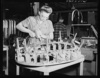 In North American's plastic department, a woman employee drills a part while it is held firmly on a jig