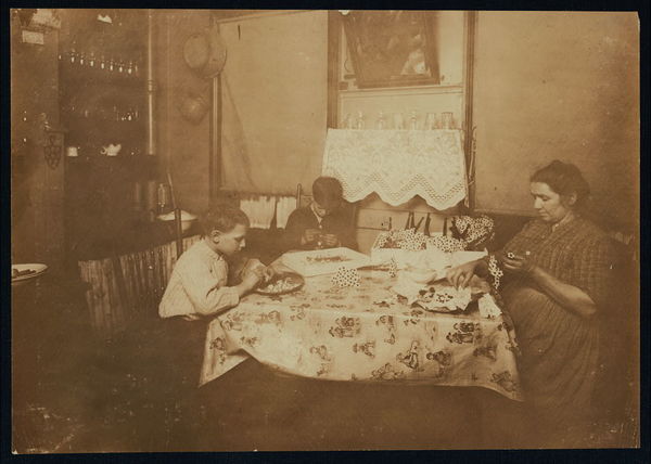 A Night Scene (Photo by 9:00 P.M.) Flower making. Family of Mary Bezzola, 212 Sullivan St., N.Y. George (10 years old) and Levia (9 years old) work until 9:00 P.M. when work is rushing. Location: New York, New York (State)
