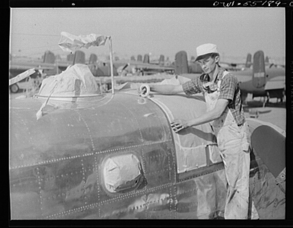 A painter on the flight ramp marks off the transparent enclosure on a North American B-25 bomber before adding the camouflage paint of the United States Army Air Force. Windows covered with brown paper