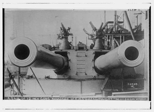 A pair of 12" guns -- Broadside of HMS DREADNOUGHT -- the all big gun warship
