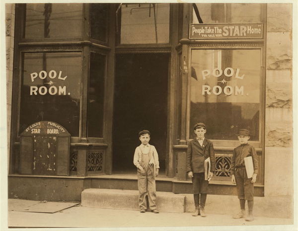 A Pool Room Branch (Chouteau & Manchester). These boys were playing pool and smoking in the Pool Room while waiting for papers. The smallest boy is 9 years old and sells until 9 P.M. (See also 1350, 1351 & 1352.) Location: St. Louis, Missouri.