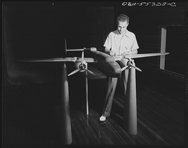 A scale model of North American's B-25 bomber is placed in the company's new wind tunnel