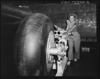 A landing gear ready for assembly on a North American B-25 is rolled into place on the final assembly line