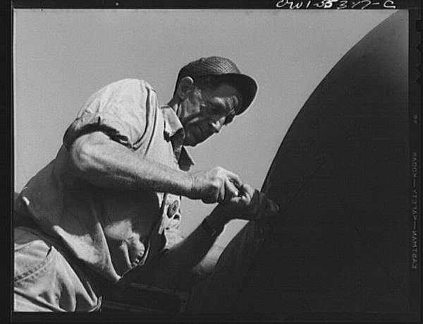A skilled employee at North American assembles the cowling on a North American B-25 bomber
