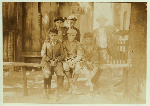 A Sunday hand-out of doffers and other mill fellows. Reputed a bad lot. Smallest boy is Arthur, said he was 13 (doubtful) & been in mill 4 years. Get $3.50 a week now. Location: Columbus?, Mississippi?.