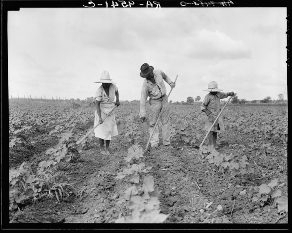 A tenant farmer and several members of his family hoeing cotton on their farm in Alabama