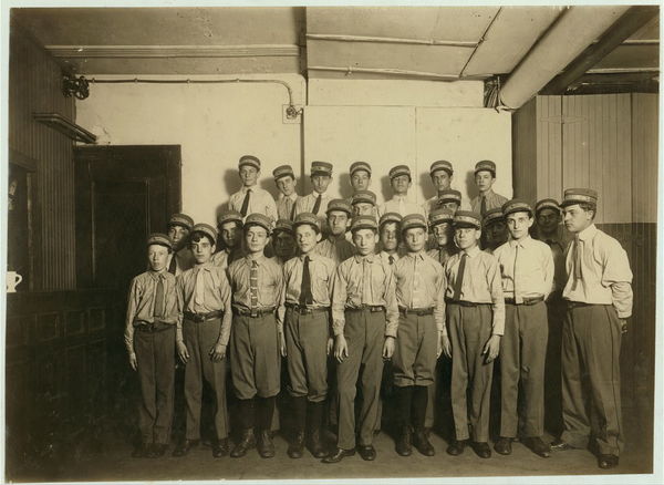A typical group of messengers at Postal Telegraph Company's main office, 253 B'roadway. During hot weather they wear these shirt waists. (A Suggestion for the other companies.) Location: New York, New York (State)