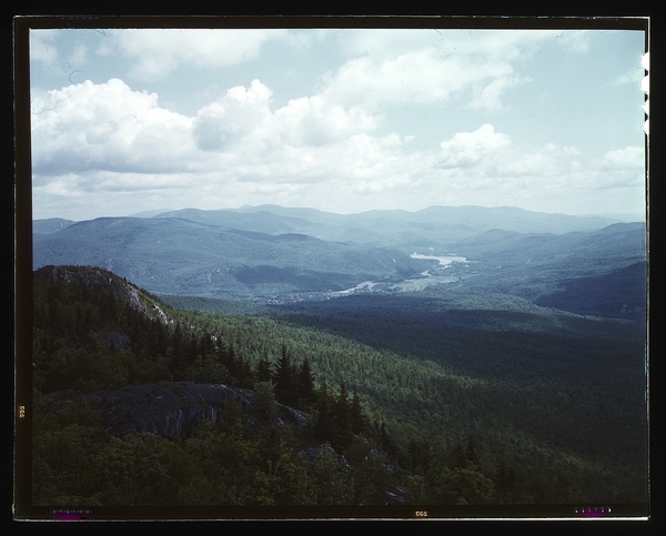 A view looking northeast from the fire tower manned by Barbara Mortensen, a fire and airplane lookout on Pine Mountain, Gorham vicinity, N.H.