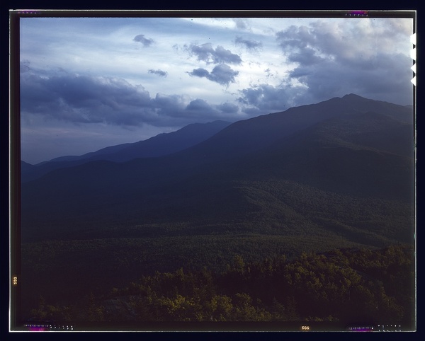 A view looking through the White Mountains from the fire control tower manned by Barbara Mortensen, a fire and airplane lookout on Pine Mountain, Gorham vicinity, N.H. View is to the south
