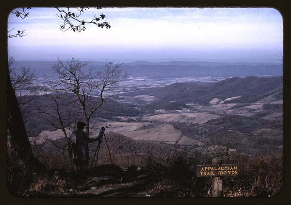 A woman painting a view of the Shenandoah Valley from the Skyline Drive, near an entrance to the Appalachian Trail, Virginia