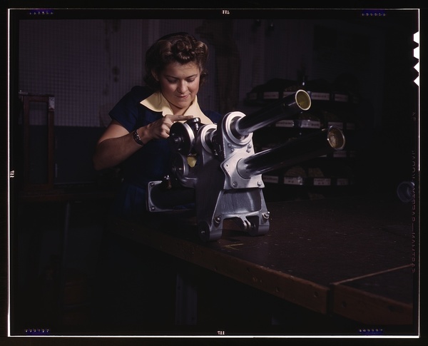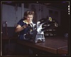 A young woman employee of North American Aviation, Incorporated, working over the landing gear mechanism of a P-51 fighter plane, Inglewood, Calif. The mechanism resembles a small cannon