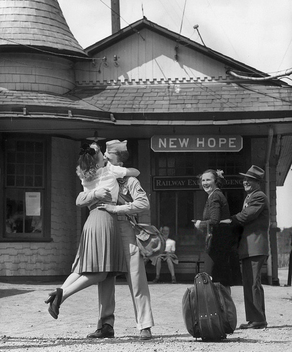 A Young Woman Lifts Her Feet While Embracing And Kissing A Uniformed Us Soldier At The Train Station, Connecticut, 1945