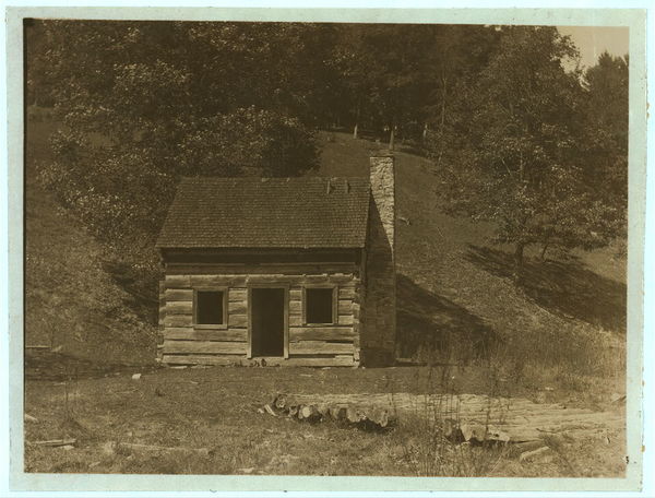Abandoned log cabin on the hillside. Not many used now but it was the only kind used a while ago. Near Sunset School, Pocahontas Co., W. Va. Location: Pocahontas County, West Virginia / Photo by Lewis W. Hine.