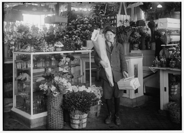 Abe Singer, 14-year old helper at Wax Florists, 143 Tremont Street. He delivers bundles, tends the door, etc. Location: Boston, Massachusetts / Lewis W. Hine.