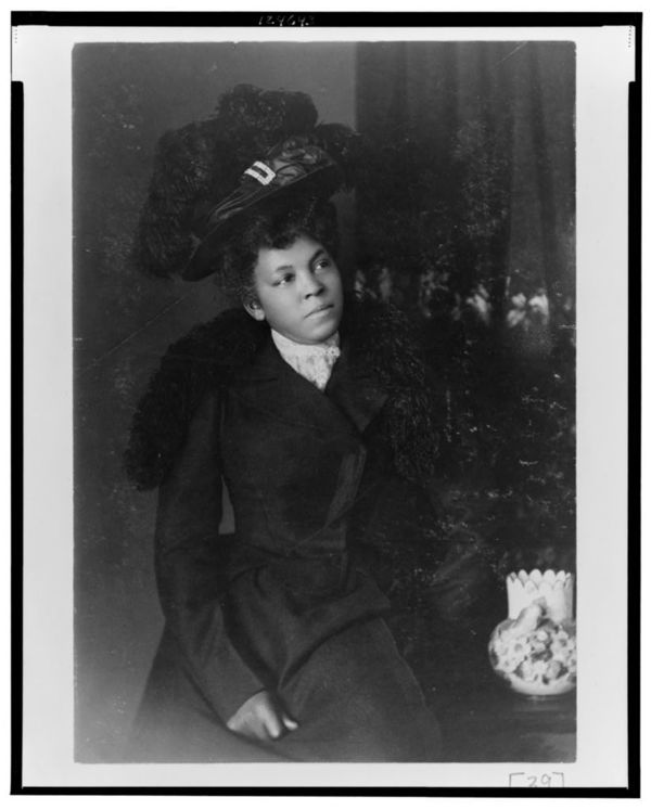 African American woman, three-quarter length portrait, facing slightly right, wearing hat