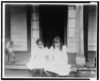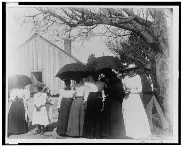 African American women holding umbrellas to provide shade from the sun, with two men, and with a building (church or meeting house) in the background