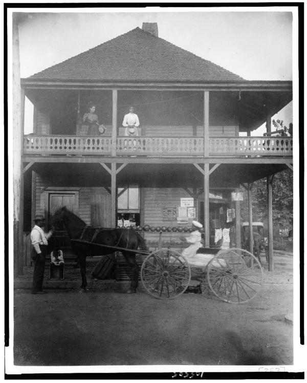 African Americans and horse-drawn wagon in front of country store, two women stand on balcony