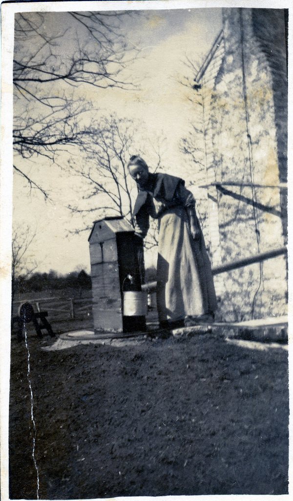Alice drawing water at the pump on the Moore Homeplace