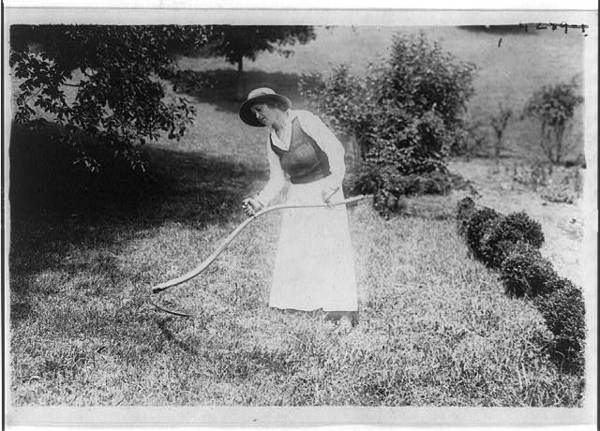Alma Gluck cutting grass with a scythe, Aug. 3, 1917