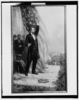 Abraham Lincoln raising flag and speaking to crowd from platform