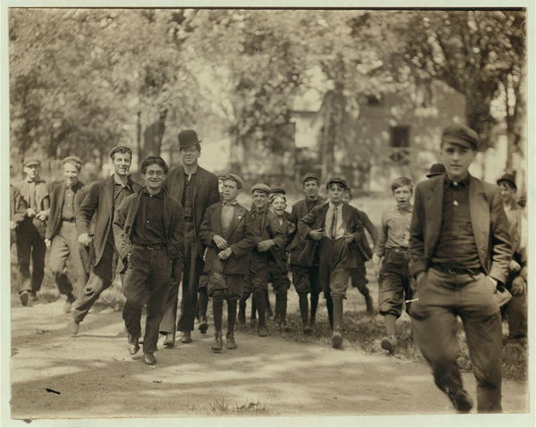 Young girls working in American Woolen Mills, Winooski, Vt. Most are illiterate. Work slack, force small. 27 children apparently under 15 years were counted at one gate. (See also N.C.L.C. Photos #720-745 May 1909.) Location: Winooski, Vermont.